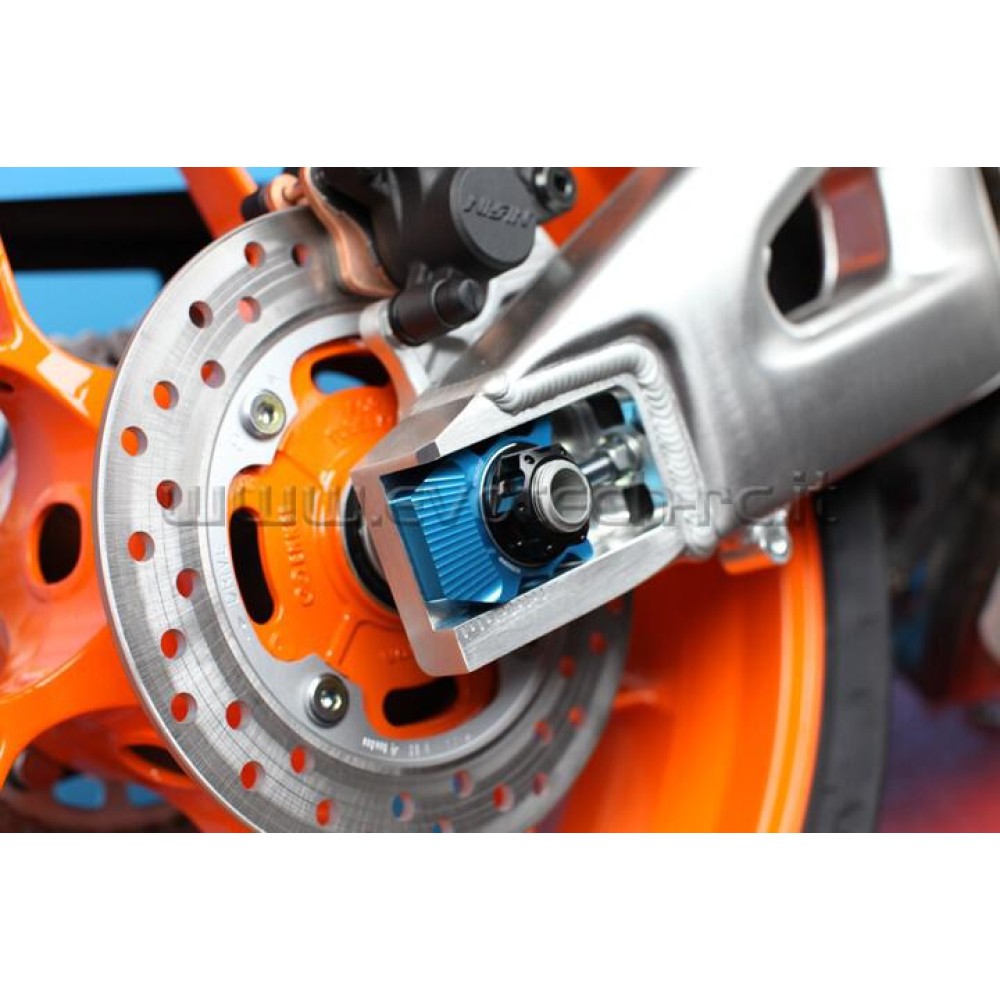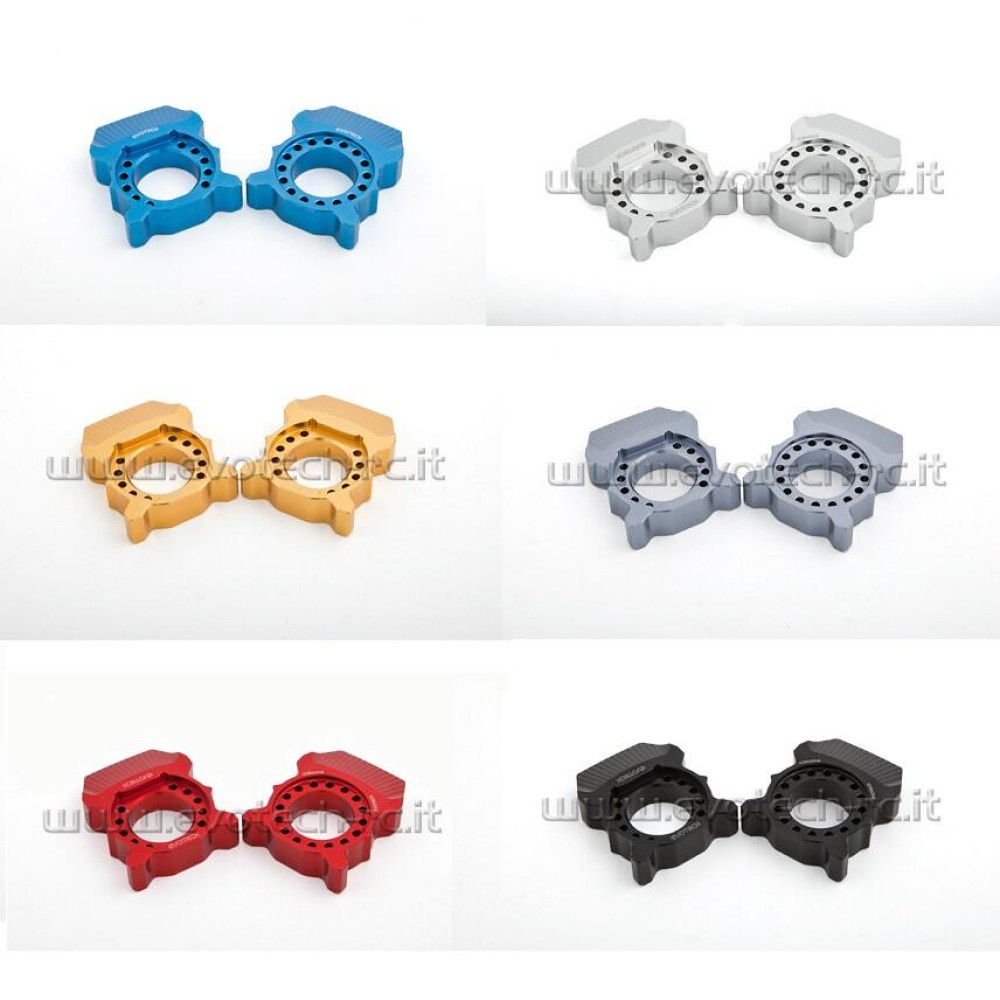 Ρυθμιστής πίσω άξονα για αλυσίδα της Ιταλικής εταιρείας Evotech ο οποίος αντικαθιστά τον original ρυθμιστή της μοτοσυκλέτας χωρίς να χρειάζεται καμία τροποποίηση.