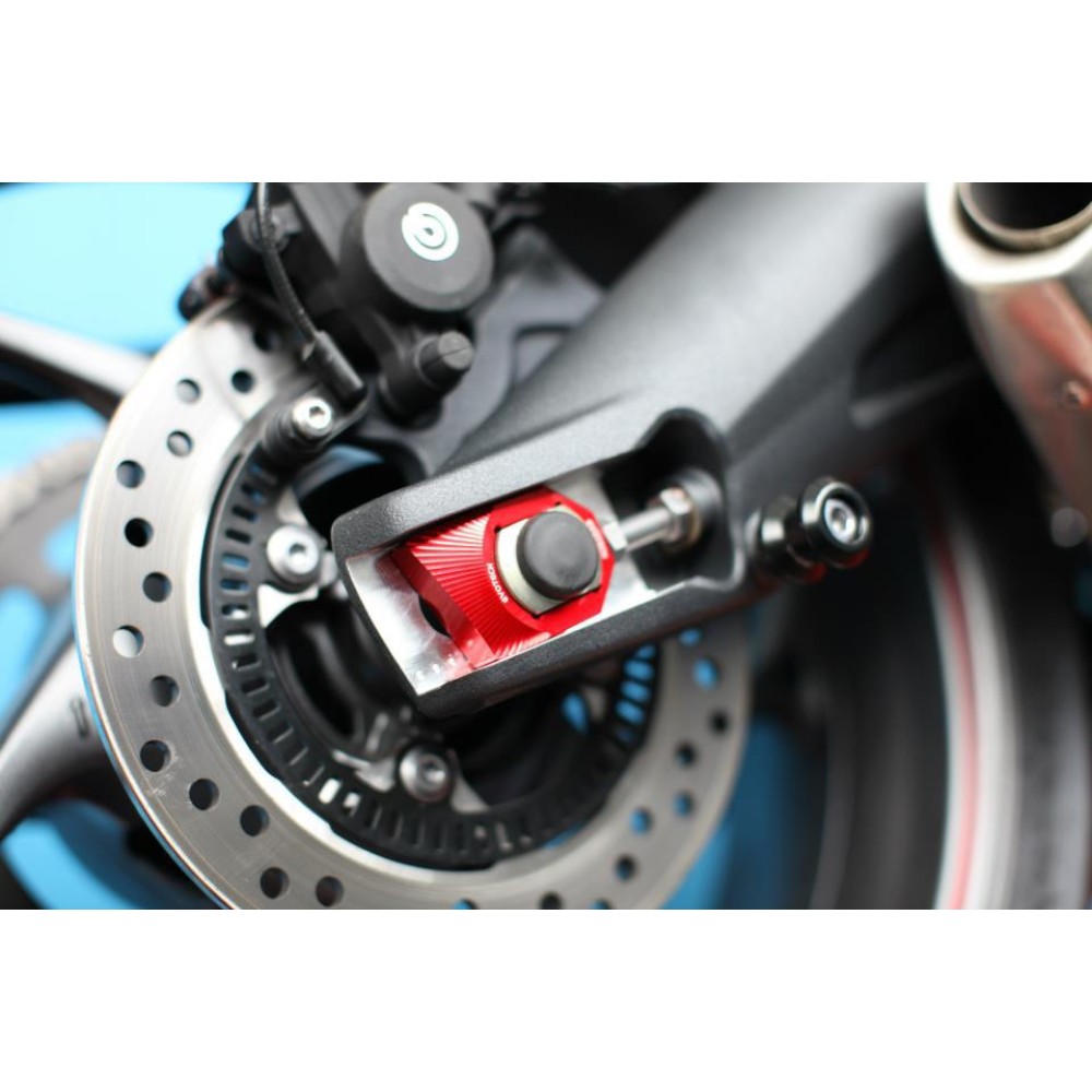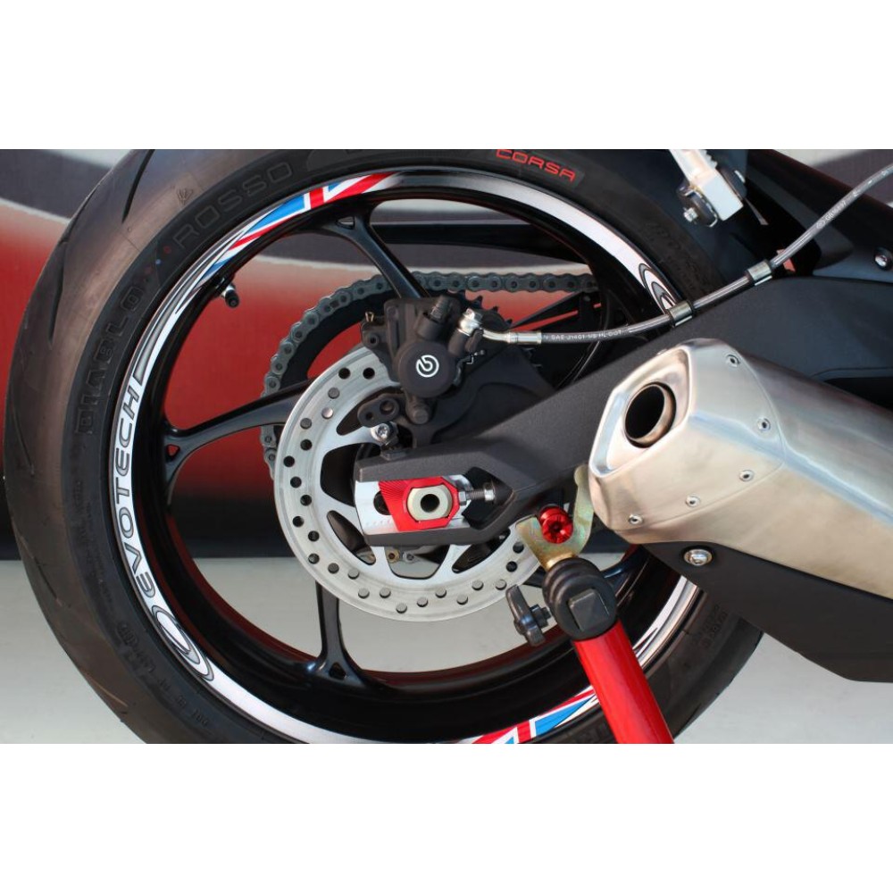 Ρυθμιστής πίσω άξονα για αλυσίδα της Ιταλικής εταιρείας Evotech ο οποίος αντικαθιστά τον original ρυθμιστή της μοτοσυκλέτας χωρίς να χρειάζεται καμία τροποποίηση.