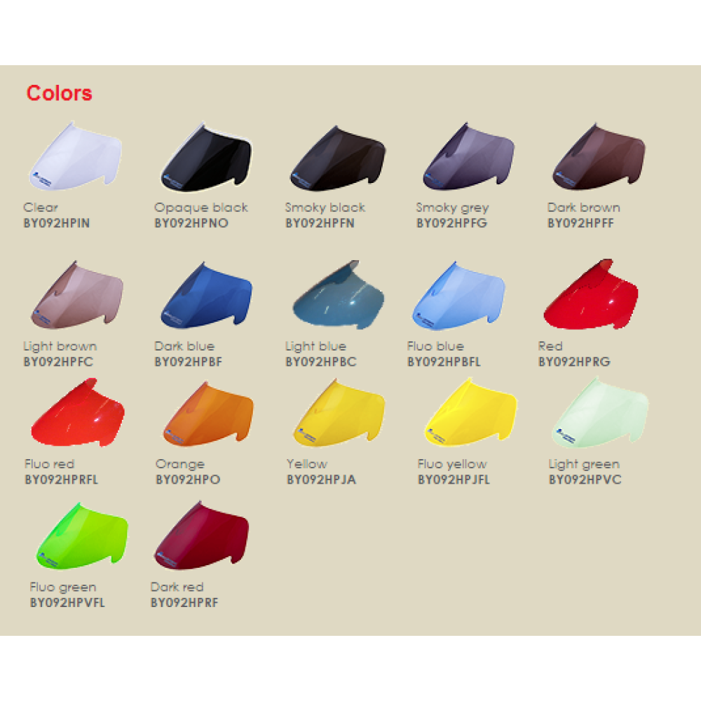 Οι ζελατίνες της εταιρείας Secdem κατασκευάζονται για όλα τα μοντέλα μοτοσυκλετών και scooter σε τέσσερις διαφορετικούς τύπους και σε πληθώρα χρωματισμών, με πάχος από 3 έως 6χιλ. Υπάρχει και δυνατότητα ειδικής παραγγελίας όσον αφορά το ύψος.